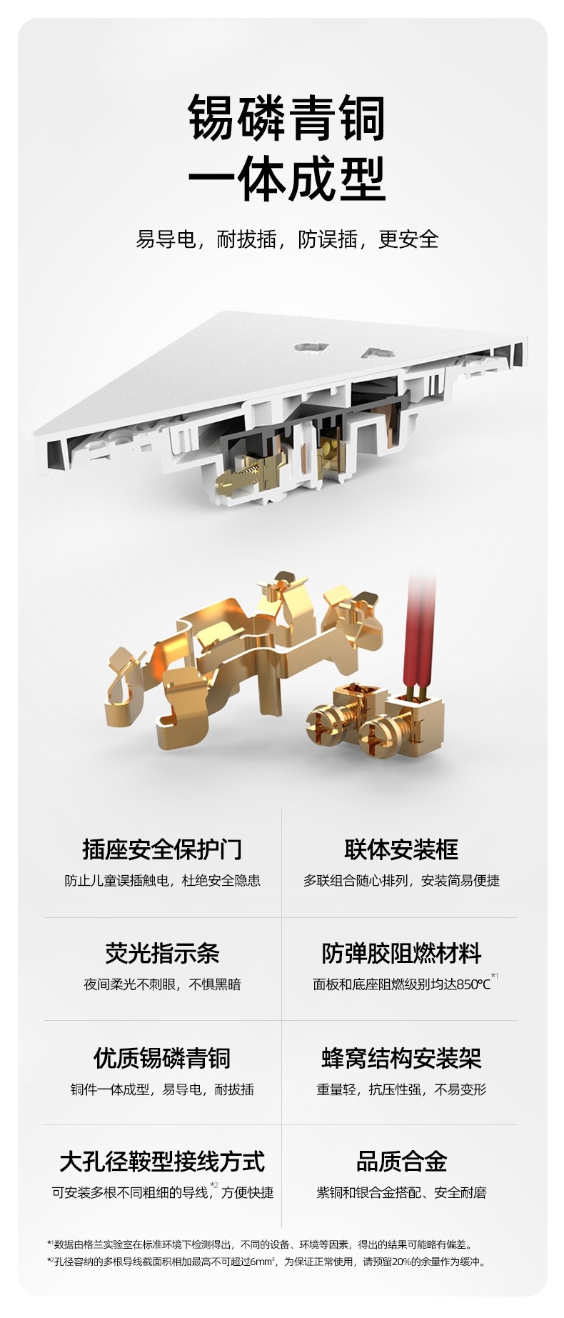 開關(guān)插座是家庭用電安全的后一道防線,因此開關(guān)插座的安全性不容忽視。E6系列精選導(dǎo)電寬度達(dá)3.8mm的錫磷青銅,導(dǎo)電快,性能好,不易變形更耐用。塑料件選用全新型進(jìn)口PC材料,1.8mm厚度面板,高溫阻燃、不易變形、易清潔;高密度高強(qiáng)度使用安全又長久。